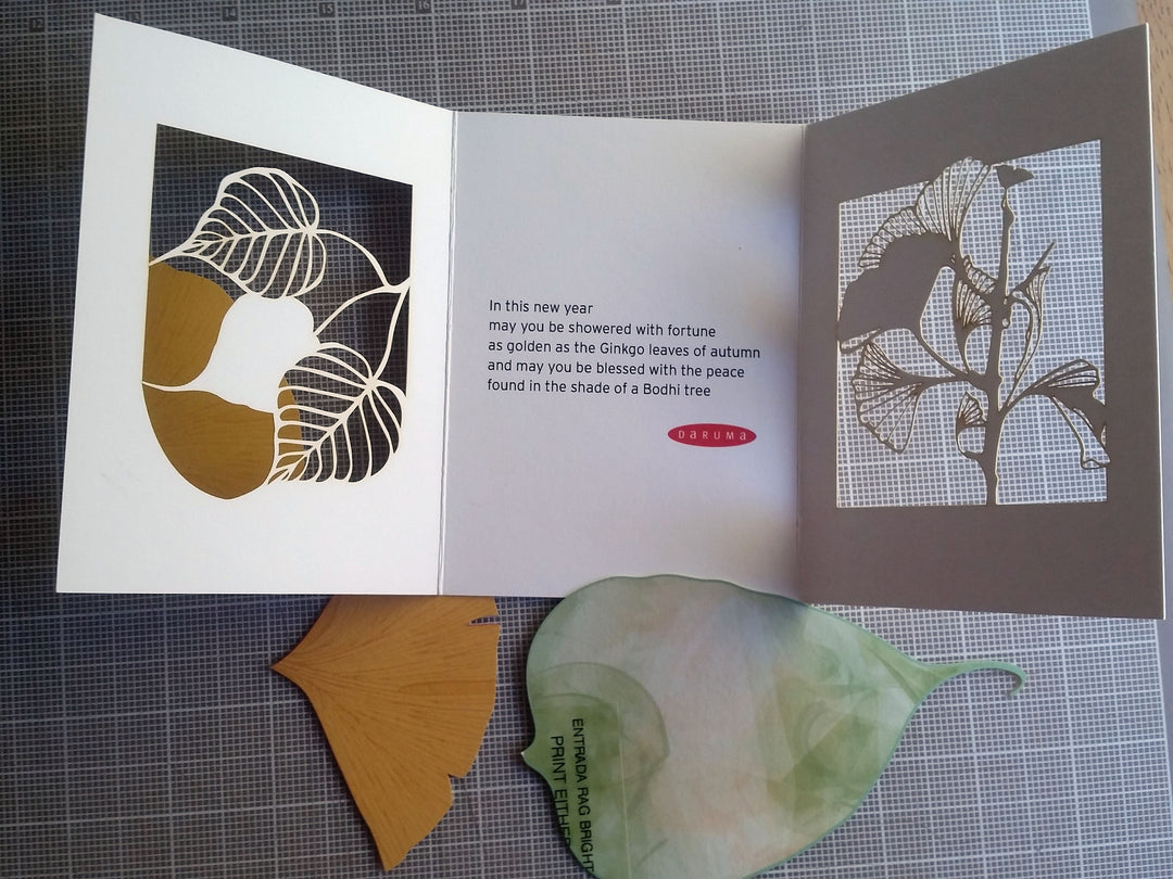 New Year greeting and product announcement for Daruma Financial. The process was collaborative and involved their corporate brand and messaging. Two panels were cut out featuring original art works with inserts—ginkgo and bodhi leaf. 1000 cards were shipped within a month of order confirmation.