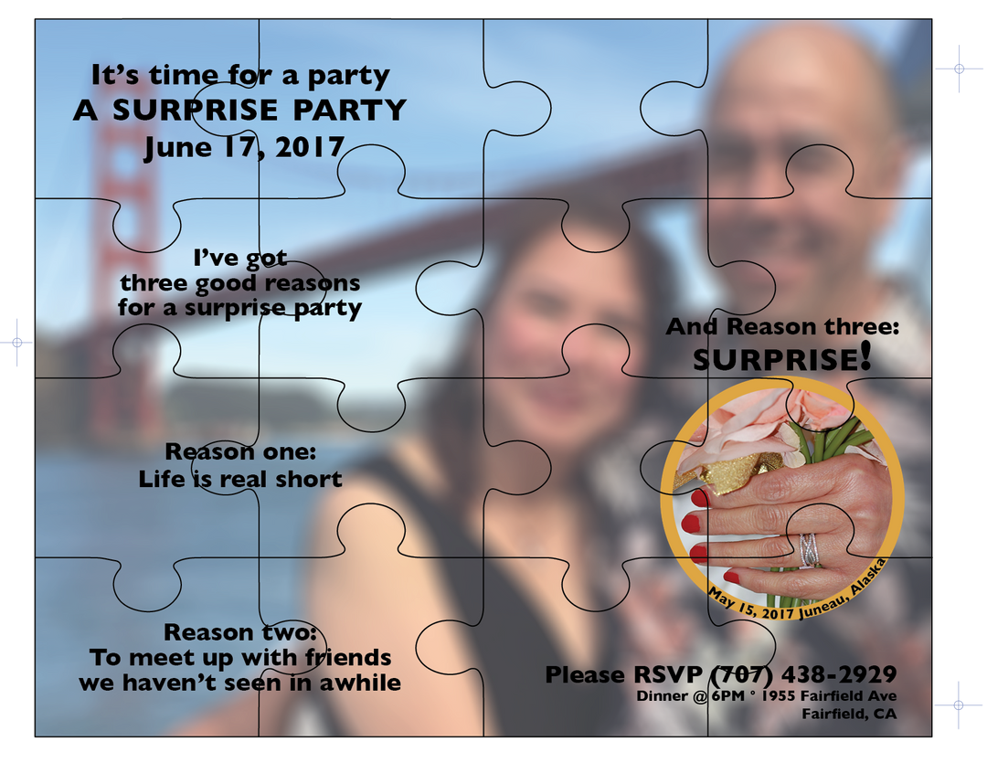 Designed as a puzzle to go out in three mailings with increasingly important information for a surprise wedding announcement and reception invitation.