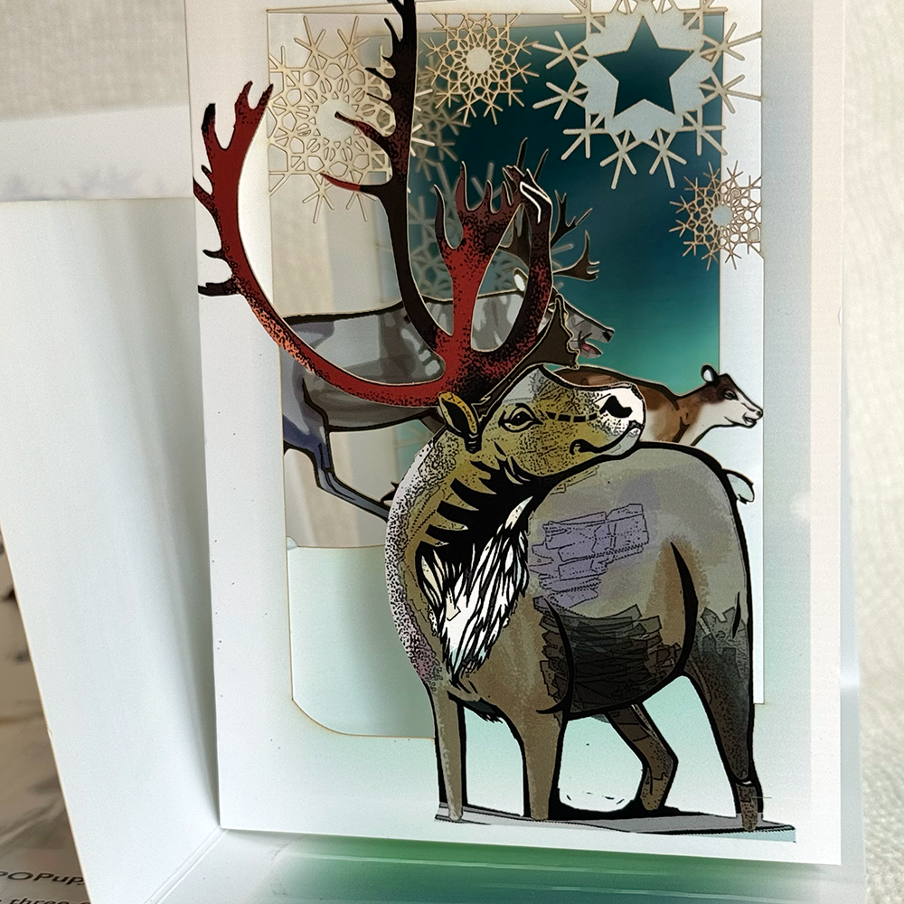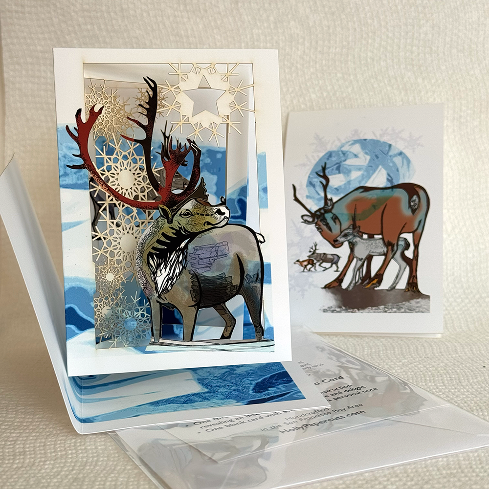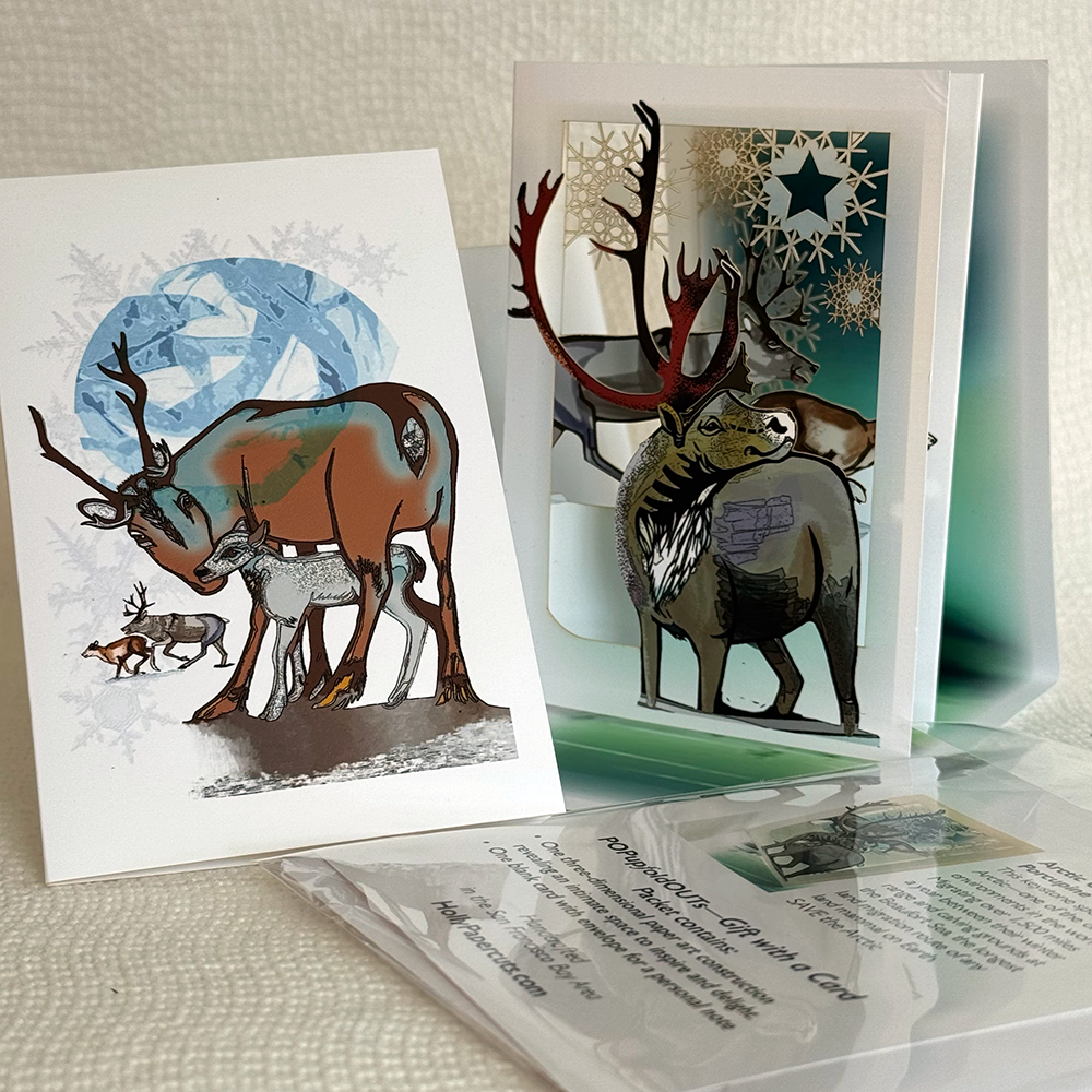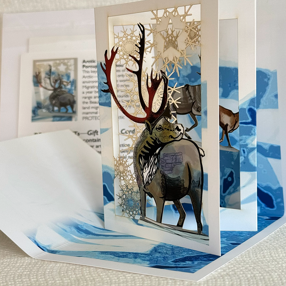 Caribou from the Porcupine Herd are framed by the crystalline icy blues of the Arctic and/or the aurora borealis displaying in the sky.