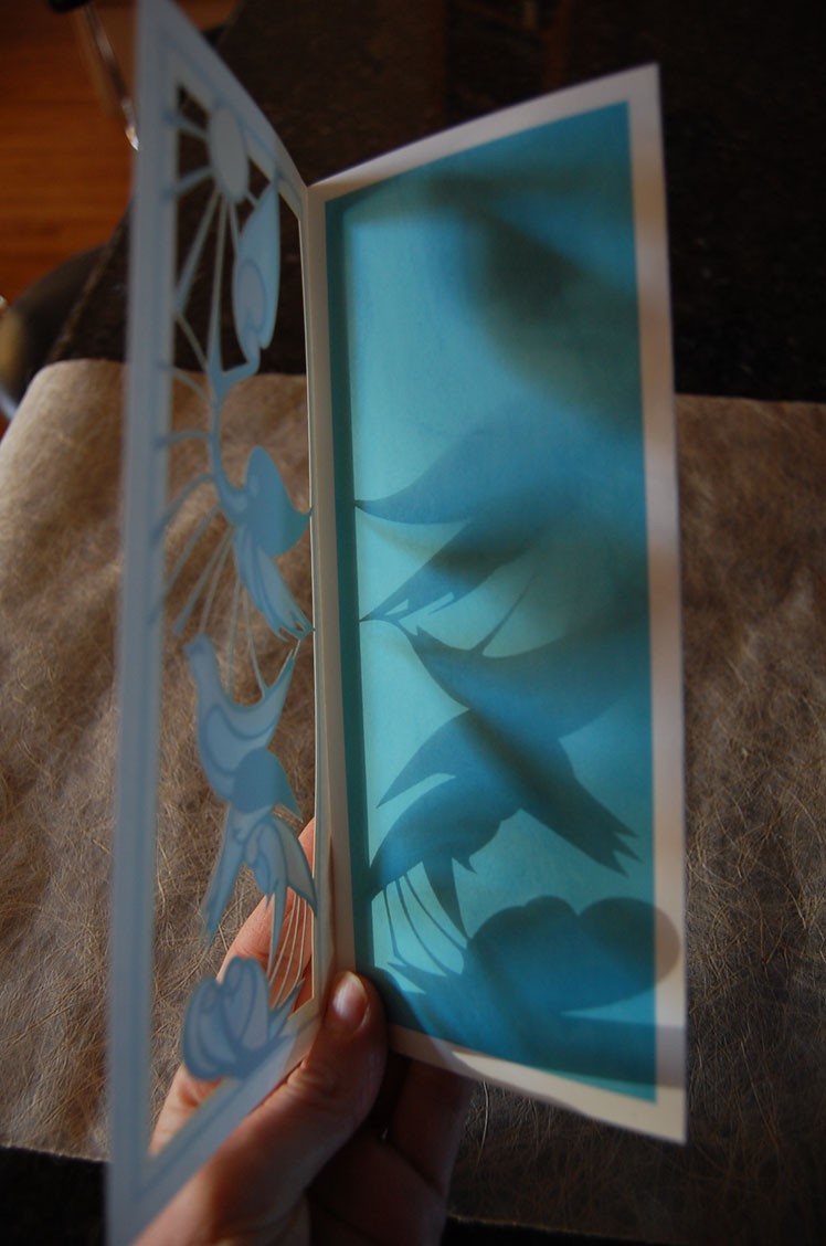 Birds ascend from perch to flight, more stylized than other images. Varied background colors with mourning doves in powdery blue moving into aqua, browns and yellows. First panel is cut out and backed by second panel of color—blue turbulence, aqua and yellow.