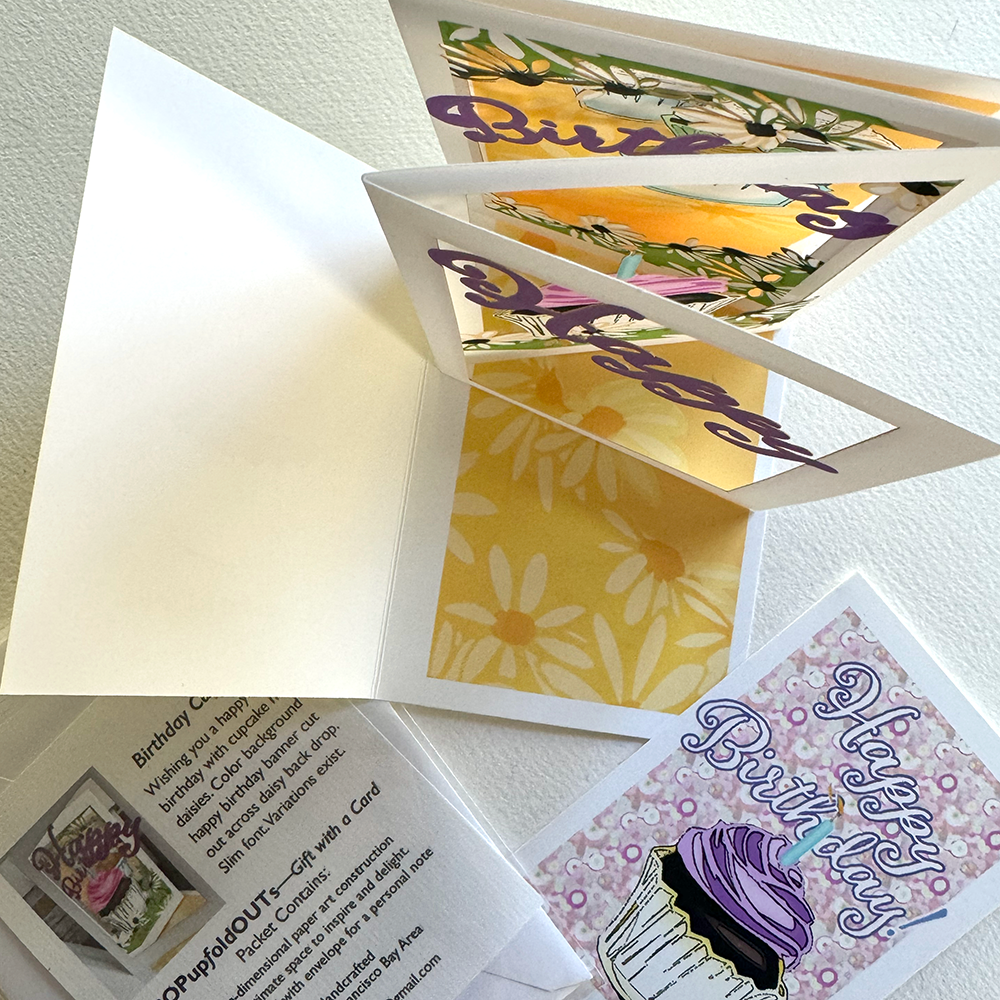 (POPupfoldOUT) 3D card featuring cupcakes in a field of daisies for happy birthday wishes. Various background colors. Two panels have the banners Happy and Birthday combining to create "Happy Birthday" in a script and flowy font. Gift + card.