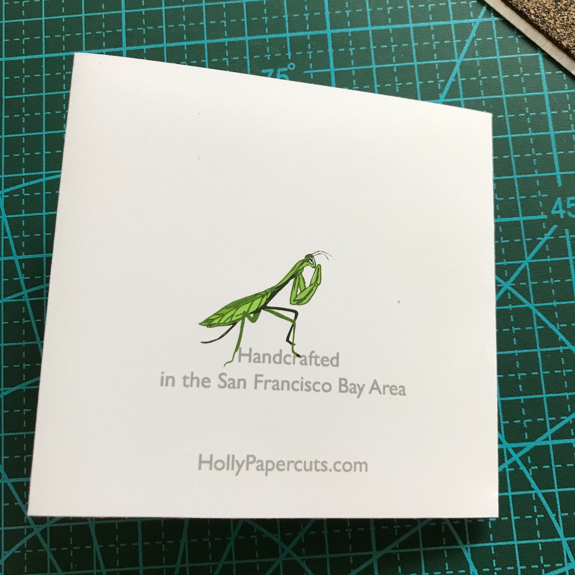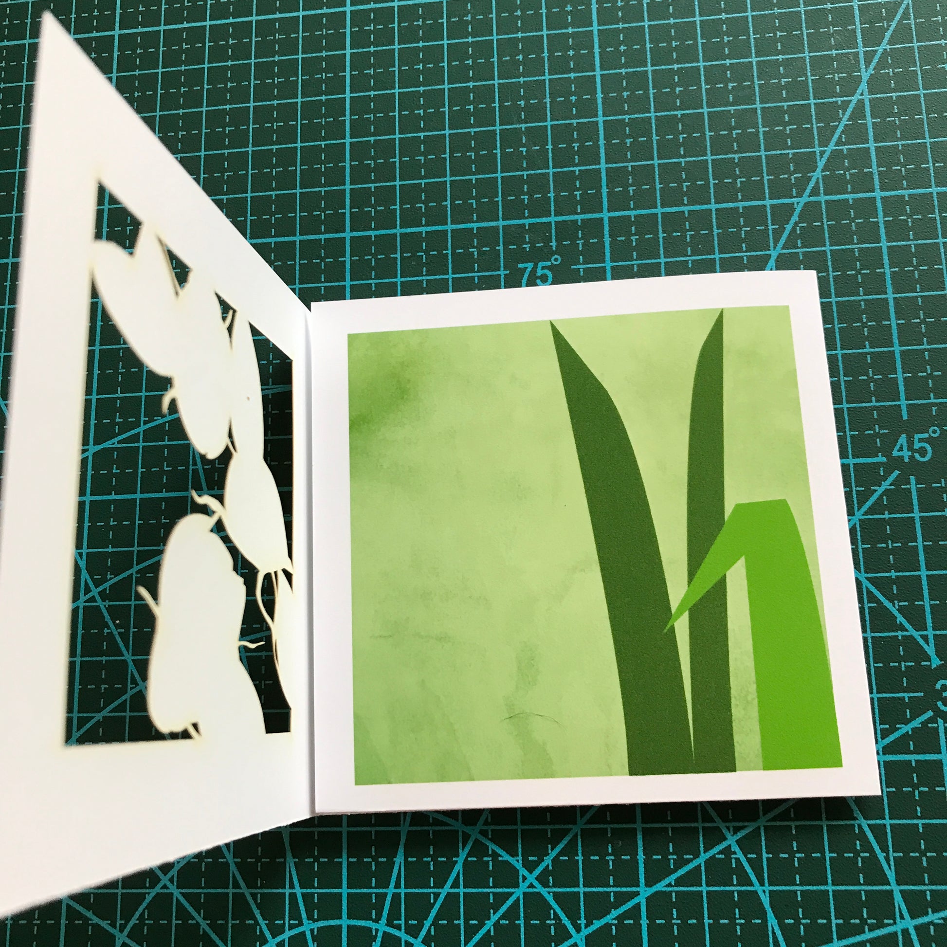 First panel intricately cut out and backed by second panel that closes to complete the illustration.