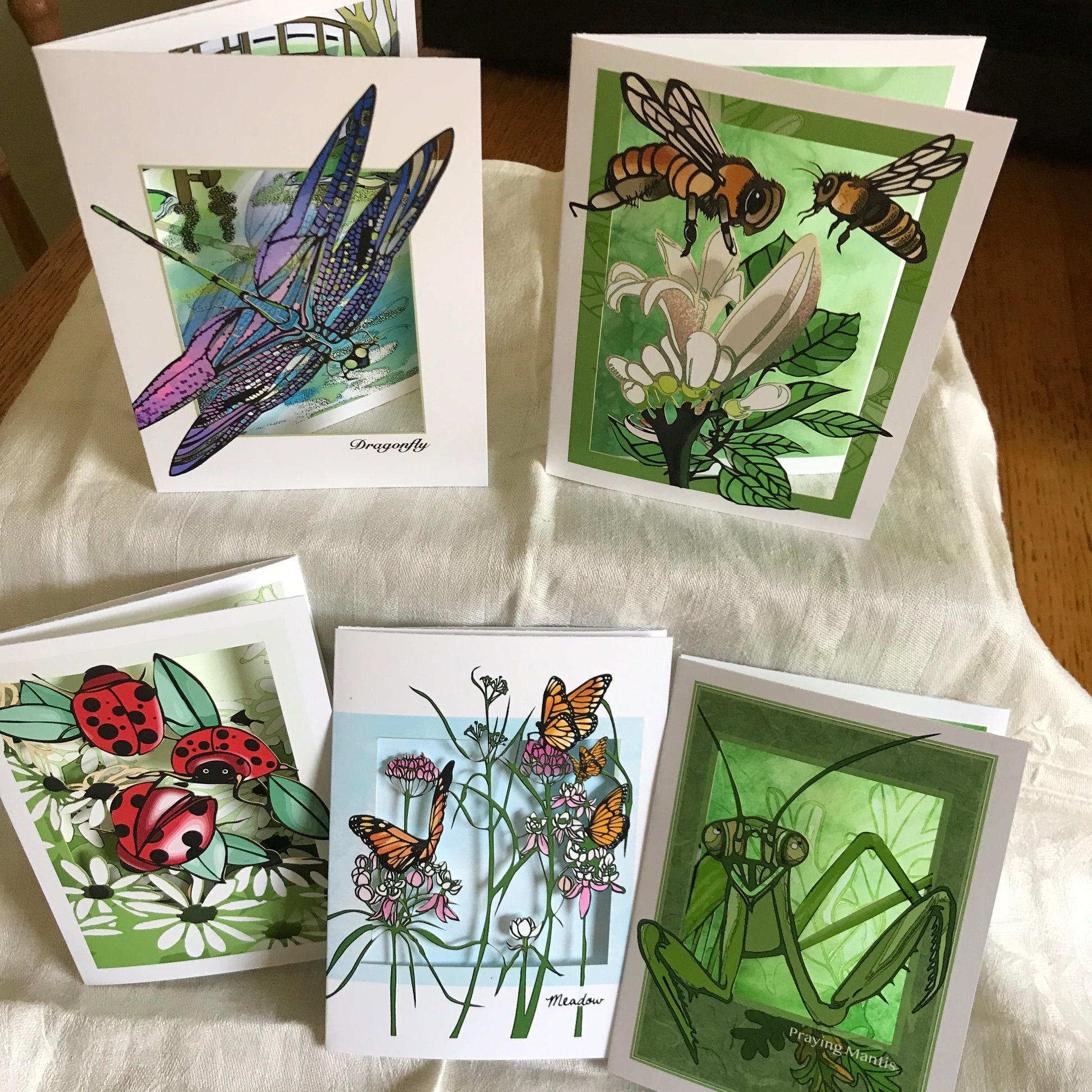 Colorful portraits of praying mantis framed in oak leaves; ants under a prism; ladybugs in a cloud of daisies; butterflies resting on narrow-leaf milkweed; honeybees lighting on citrus blossoms; and dragonfly skimming a zen garden.