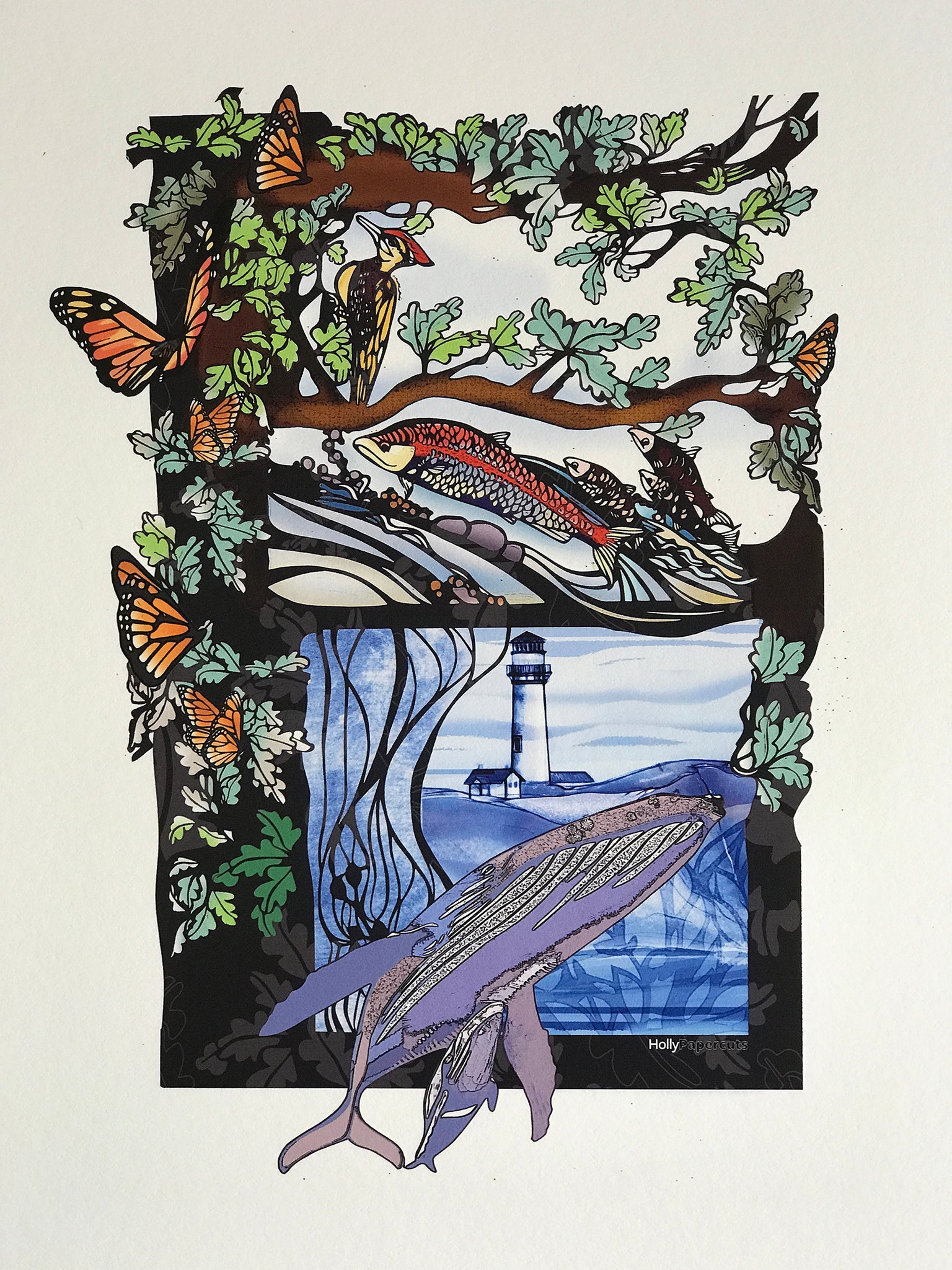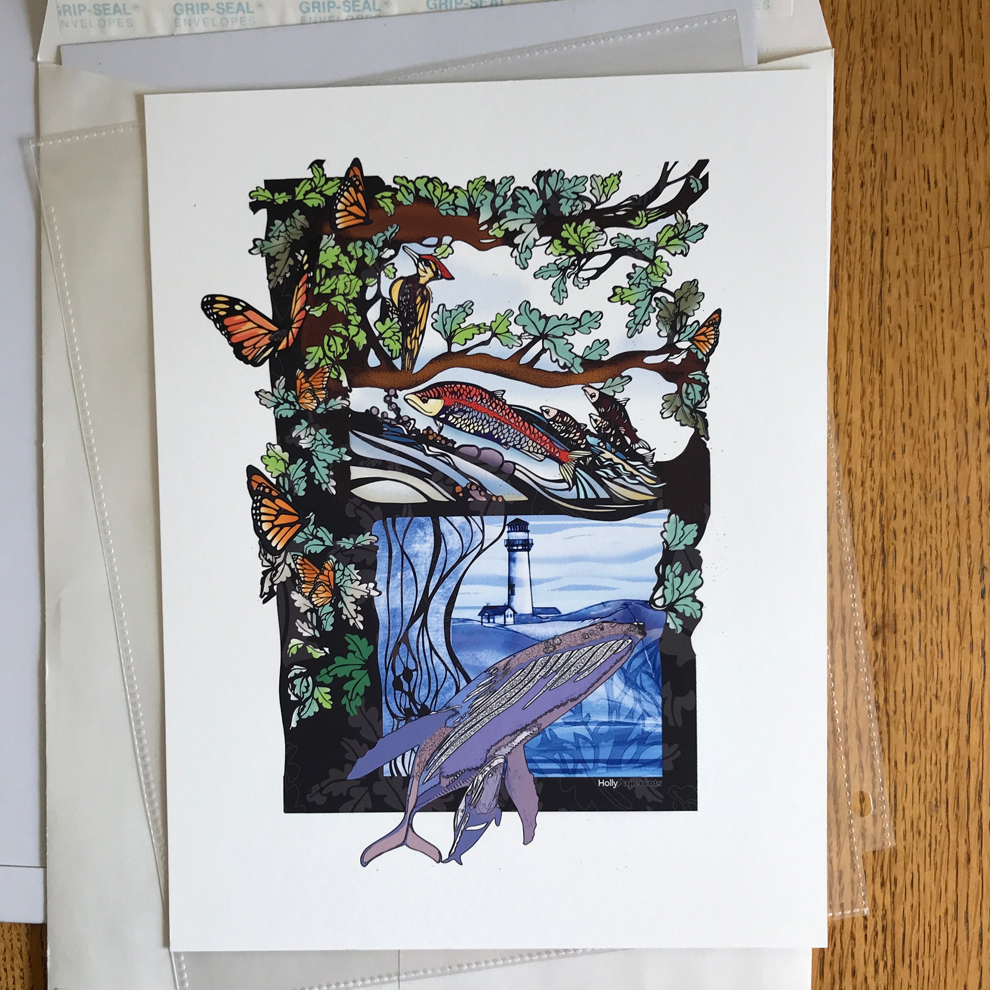 The gray whale with her calf travels south and north along the coast; salmon traveling with and against the currents of the river; and the (Monarch) butterflies alighting on oak. Full color, printed on 300gsm fine art printmaking paper giclee print.