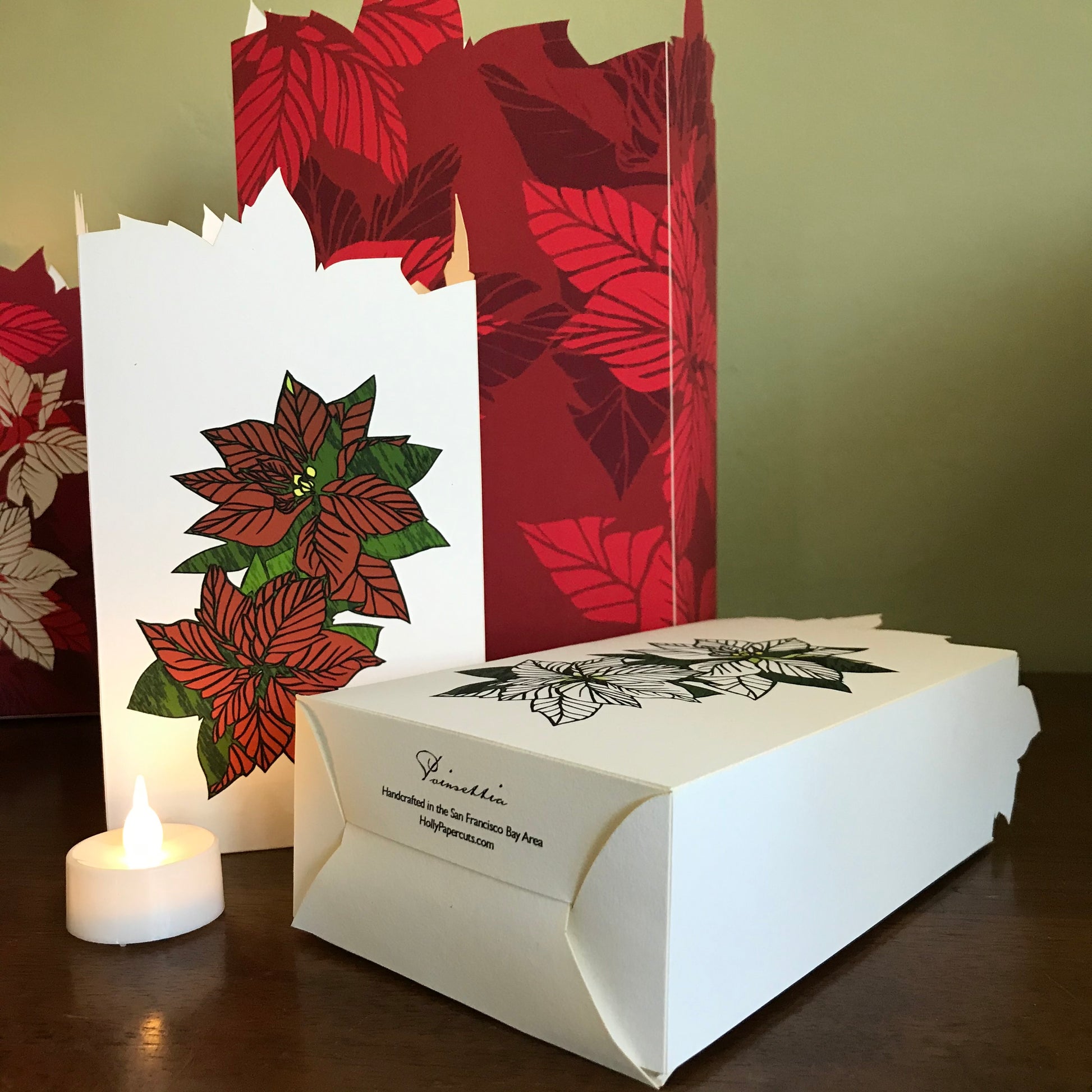 Delicate poinsettia papercut on one panel—ships in sets of 2, flat and with tea lights. Paper is high-quality printmaking fiber paper. Rim of luminaries cut out in poinsettia leaf pattern
