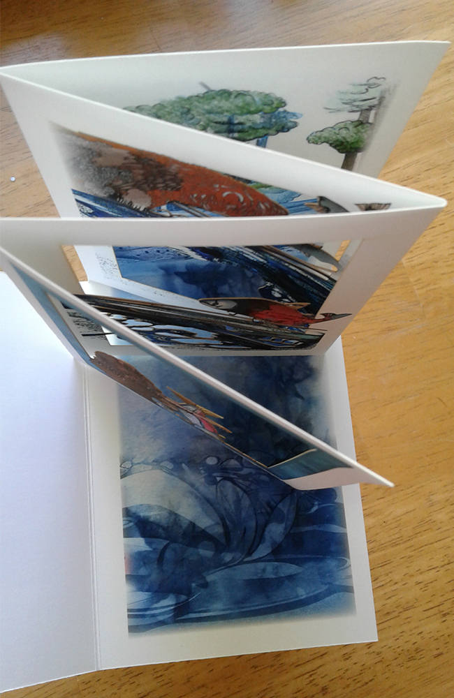 The salmon return to the river and shallows to spawn but first they have to jump rapids and bypass bears and other hunters who want to scoop them up for a meal. This POPupfoldOUT opens to that drama. A bear cub stands in the quieter water with fish larger than himself while the bigger bears reach out to the leaping salmon off the banks.